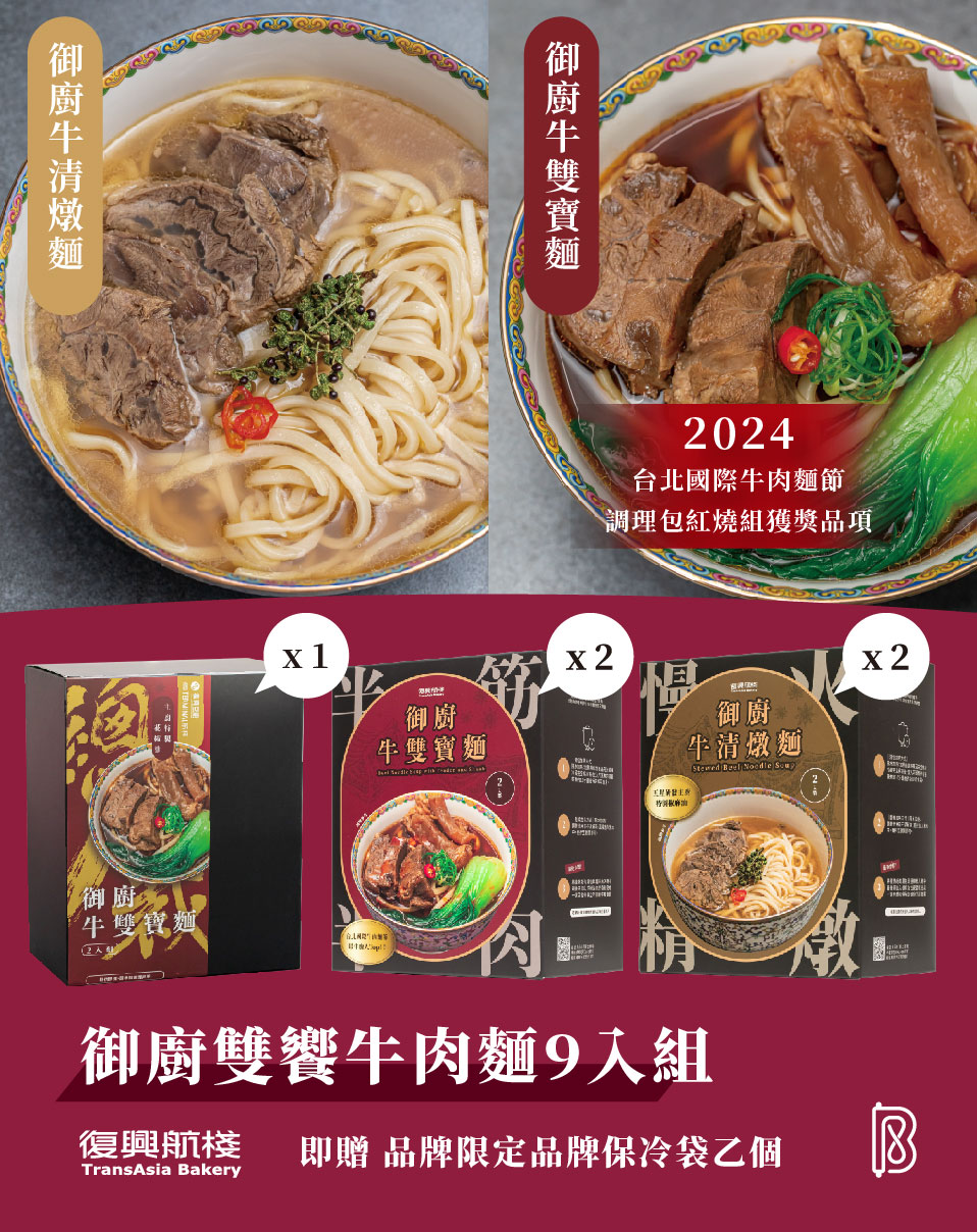 復空食品以最高食安與製作流程,打造出頂級風味調理包,網羅了濃郁紅湯與銷魂花椒油交織而成的御廚牛雙寶麵,以及風味雅緻入口有亮點的御廚清燉牛肉麵,9入大套組加送限量龍年保冷袋!