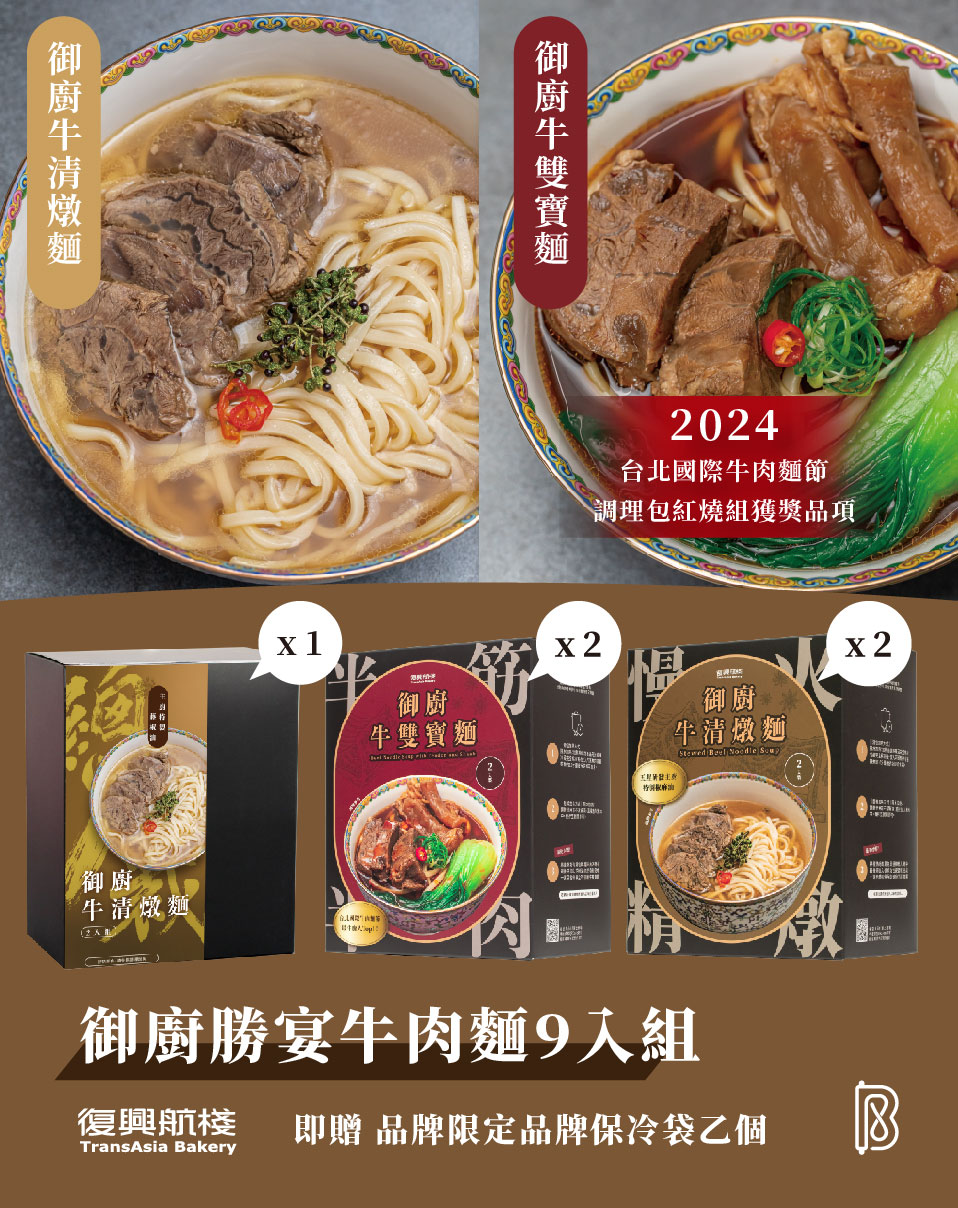 總裁御廚牛雙寶麵(2入)x2組(2024台北國際牛肉麵節調理包紅燒組Top10獎項)+總裁御廚牛清燉麵(2入)x2組+總裁御廚牛雙寶麵(1入)x1組+龍年品牌保冷袋x1個